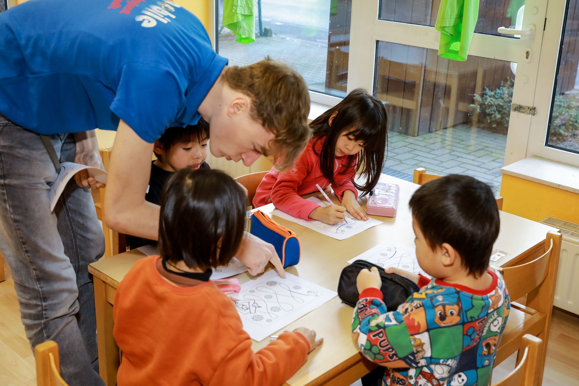 Wir begrüßen uns in der Morgenrunde in vier Sprachen und fördern Deutsch, Englisch, Französisch und Japanisch in kleinen Gruppen.